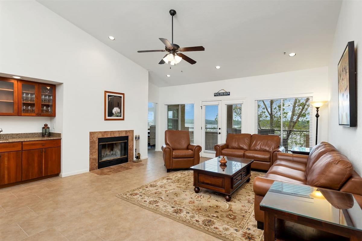 The Island on Lake Travis features a gated entry for security, reserved parking, beautiful Mediterranean architecture, and landscaped courtyards throughout the complex. As you enter the Villa, located on the third floor, you are greeted by a large family room complete with comfortable seating, tile floors, wet bar, fireplace, vaulted ceiling, and patio access with panoramic lake views. Other features include a large HDTV, WiFi, and plenty of space for entertaining. The kitchen is spacious, fully stocked, and has bar stool seating for 4. The large alcove dining area has a beautiful round table, cathedral ceiling, and panoramic views of Lake Travis and the Texas Hill Country. This a great spot for family conversation and game time!