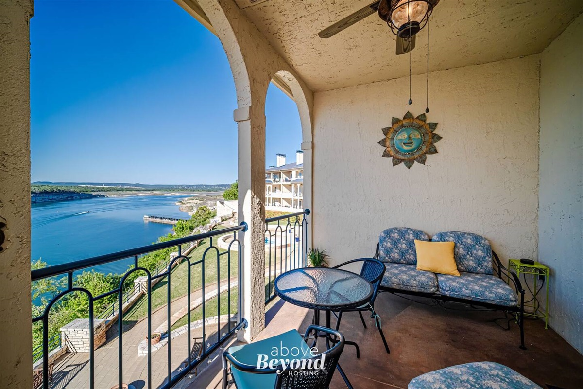 Modern kitchen has all the basics you could need...including complimentary coffee, tea and hot chocolate. Washer/ Dryer are available in a shared, coin operated laundry room in the complex. Master bedroom is furnished with a comfortable KING sized bed. Take your relaxation out onto the patio space and take in the incredible views and some of the best sunsets on our Lake and in the Texas Hill Country! You will find we have equipped our space with lots of extras...pool towels, pool noodles, tennis racquets, etc!