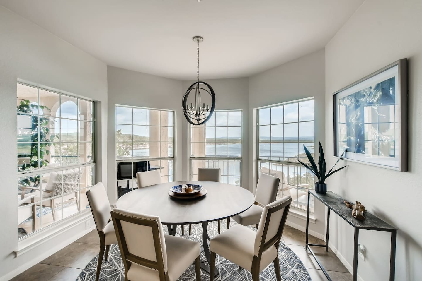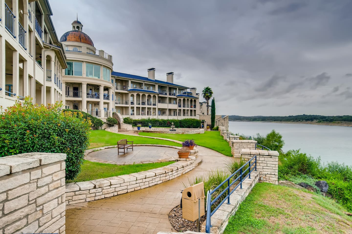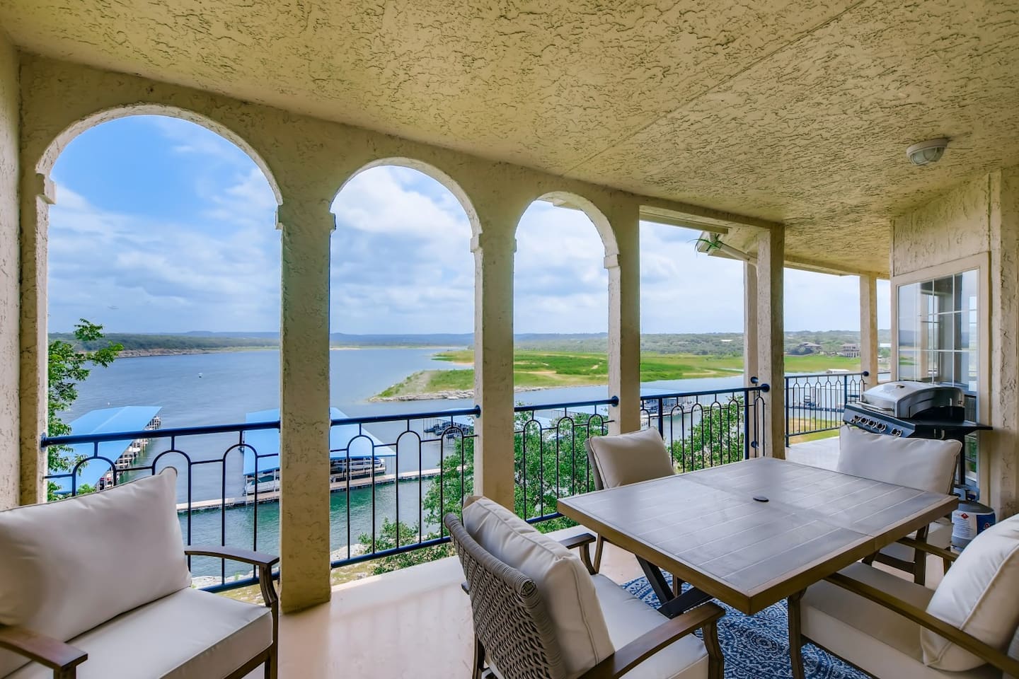 Breathtaking waterfront resort villa with 1750 sf, newly renovated & designer furnished. 3 bed/2 baths, sleeps 6-8 people with unique wrap around porch and panoramic view on lake travis. Full access to island amenities including indoor/outdoor pools, hot tub, spa/fitness facility, tennis court and picnic area. 2 large covered parking spots. 26' boat slip is available to rent. Pets are allowed with additional fee.