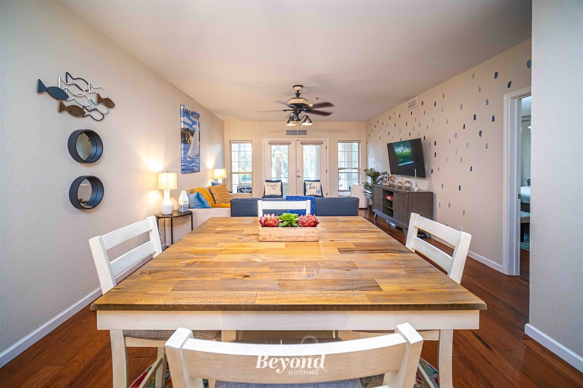 You have access to the property along with the fitness area and tennis/pickle ball courts. The restaurant is currently closed, but there are places in town that have amazing food.