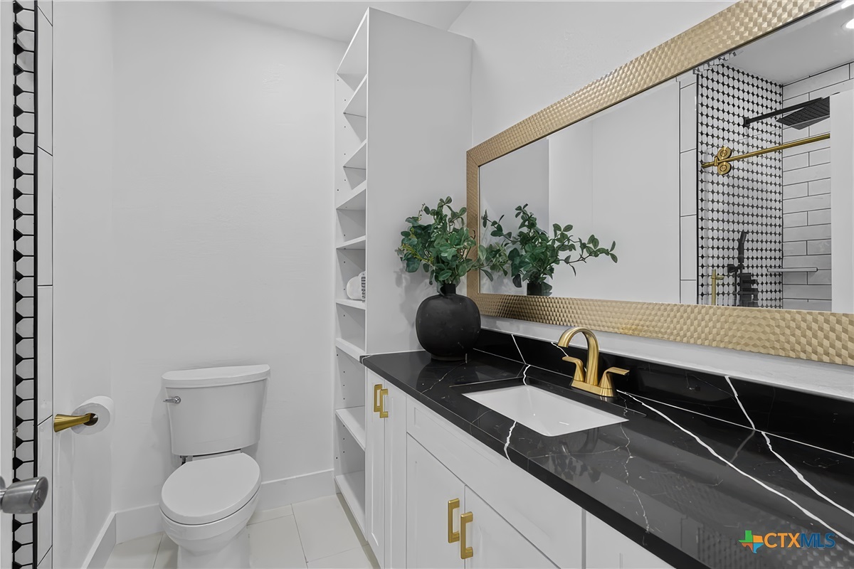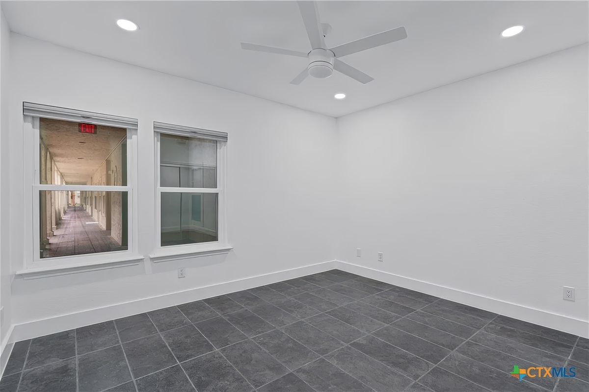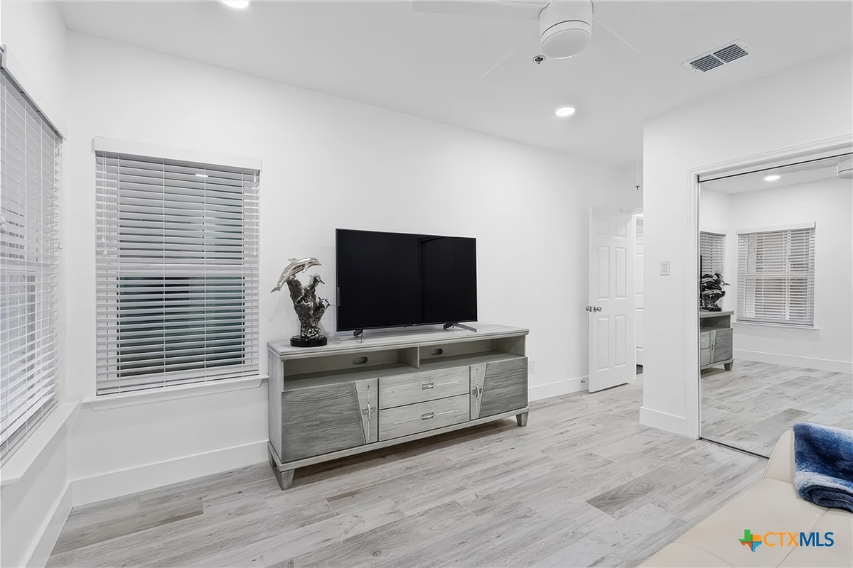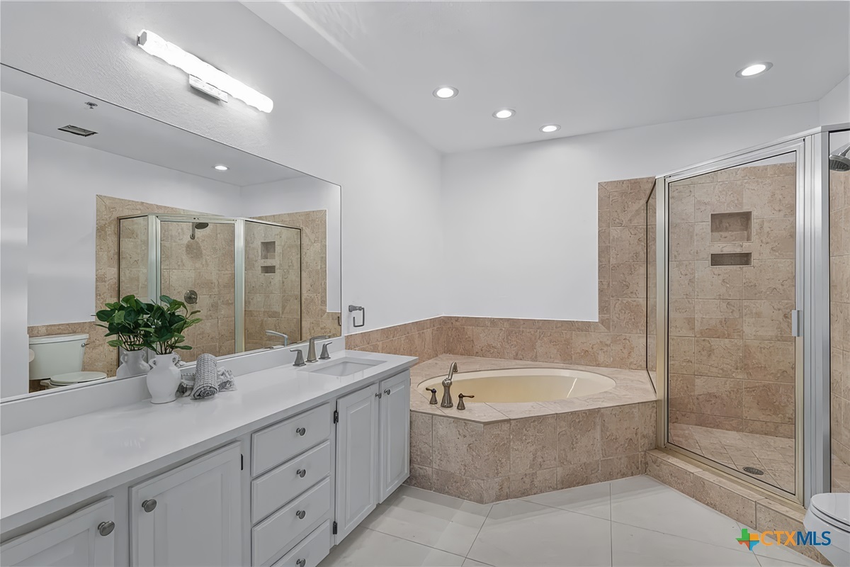The large master bedroom suite is amazing and has a tile floor, cathedral ceiling, king size bed, and a beautiful area rug in front of the cozy fireplace. All, of course, with panoramic lake views and patio access.There is also a large, en suite bath with jetted tub, walk-in shower, double vanity, and oversized closet. This master retreat has wall-to-wall windows facing Lake Travis, private patio access with open air seating, and is truly a great place to relax and unwind.