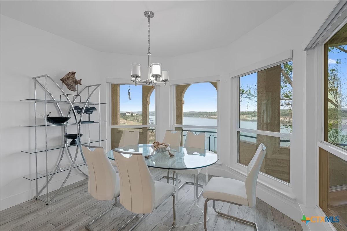 The Island on Lake Travis features a gated entry for security, reserved parking, beautiful Mediterranean architecture, and landscaped courtyards throughout the complex. As you enter the Villa, located on the third floor, you are greeted by a large family room complete with comfortable seating, tile floors, wet bar, fireplace, vaulted ceiling, and patio access with panoramic lake views. Other features include a large HDTV, WiFi, and plenty of space for entertaining. The kitchen is spacious, fully stocked, and has bar stool seating for 4. The large alcove dining area has a beautiful round table, cathedral ceiling, and panoramic views of Lake Travis and the Texas Hill Country. This a great spot for family conversation and game time!