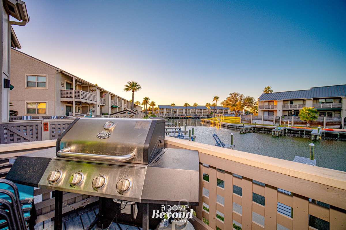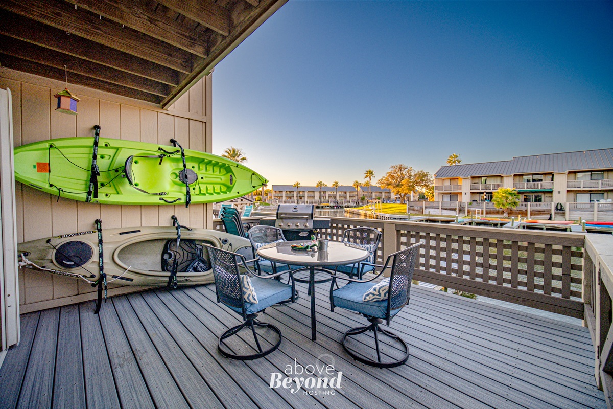 Come test your vacation skills out and to breathe easy with lovely views from your own back deck. The grill is ready for tasty bites! The sunset is ready for your viewing! And we are excited to host you. See you soon! The open concept kitchen, dining, and living space downstairs sprawls toward the back deck which overlooks the lovely inner canal. There is a bedroom with a built-in full bathroom walk-in shower downstairs and 2 private bedrooms upstairs with a tub & shower combination. 2 kayaks, outdoor dining, and a propane grill adorn the back deck, and the canal is just a few stairs from the deck.